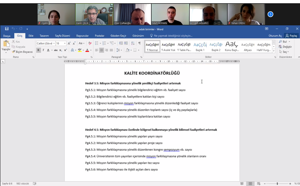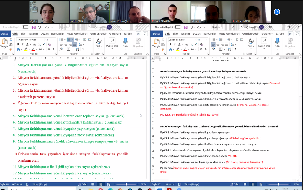 Sürekli iyileşme ve gelişerek daha iyiye ulaşmak için Stratejik Hedef ve Gösterge güncelleme hazırlık çalışmaları kapsamında paydaşlarımızdan gelen öneri ve görüşlerin konsolide edilmesi ile benzer performans göstergelerinin tek başlıkta toplanarak bir sonraki üst komisyonlarda yapılacak toplantılara ve sunuma hazırlık yapılması amacıyla Strateji Geliştirme Daire Başkan Vekili Kadir ÇELİK başkanlığında Kalite Koordinatörlüğünün katılımıyla 03.05.2021 tarihinde çevrimiçi toplantı gerçekleştirilmiştir.