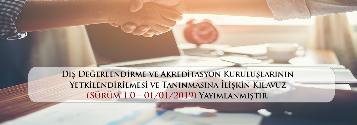 30604 sayılı ve 23/11/2018 tarihli Resmi Gazete’de yayımlanan Yükseköğretim Kalite Güvencesi ve Yükseköğretim Kalite Kurulu Yönetmeliği’nin “Akreditasyon kuruluşlarının yetkilendirilmesi ve tanınma süreci” başlıklı 27. Maddesi kapsamında; Dış Değerlendirme ve Akreditasyon Kuruluşlarının Yetkilendirilmesi ve Tanınmasına İlişkin Kılavuz (Sürüm 1.0) yayımlanmıştır.