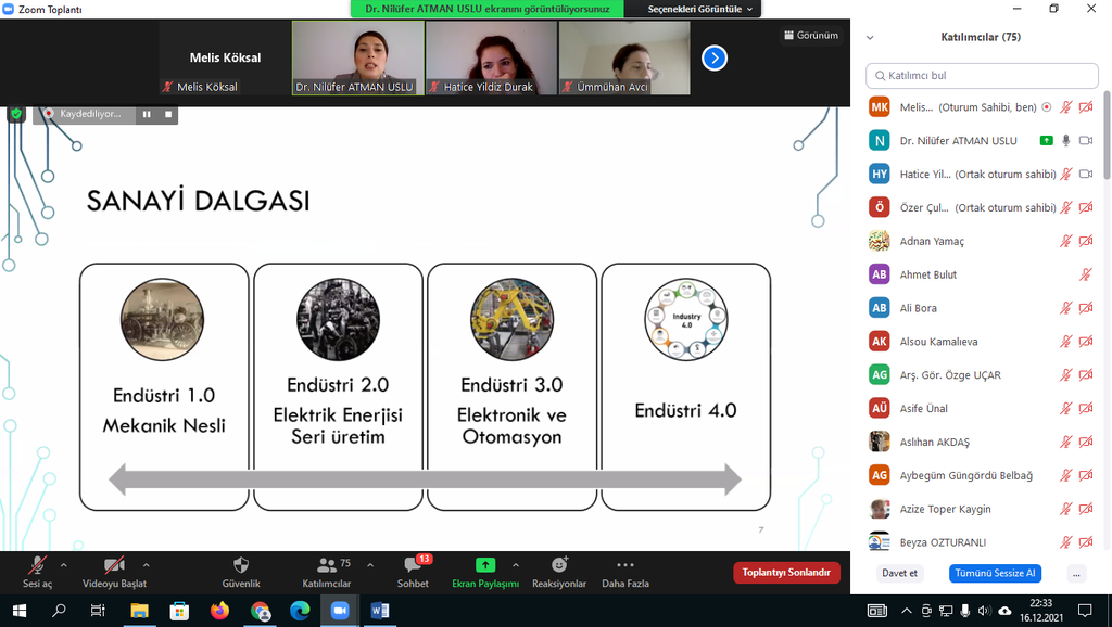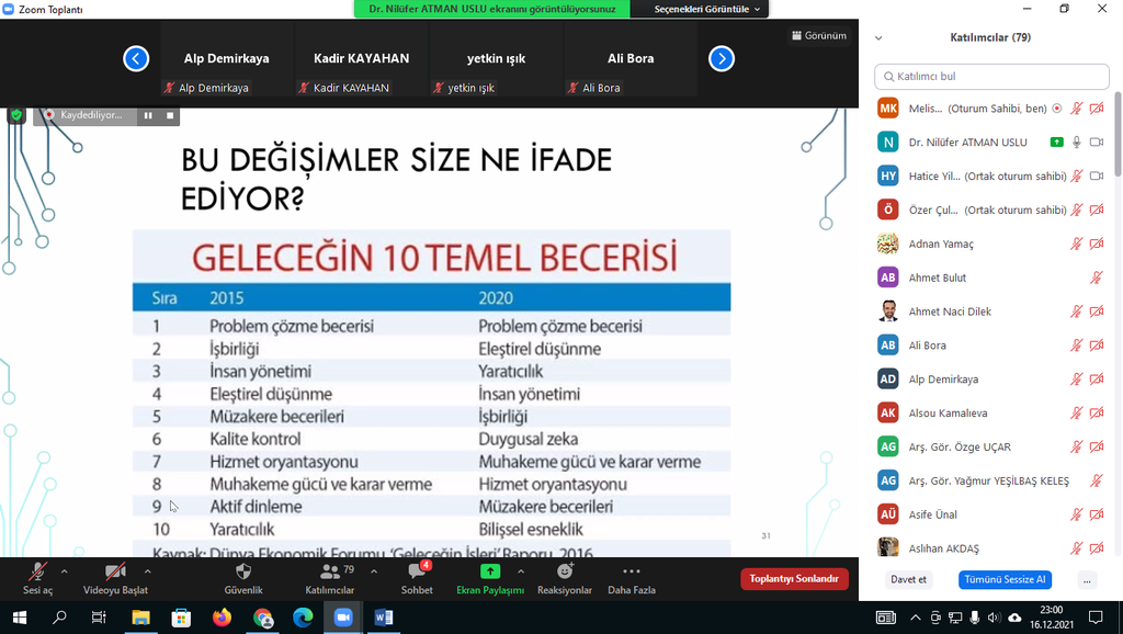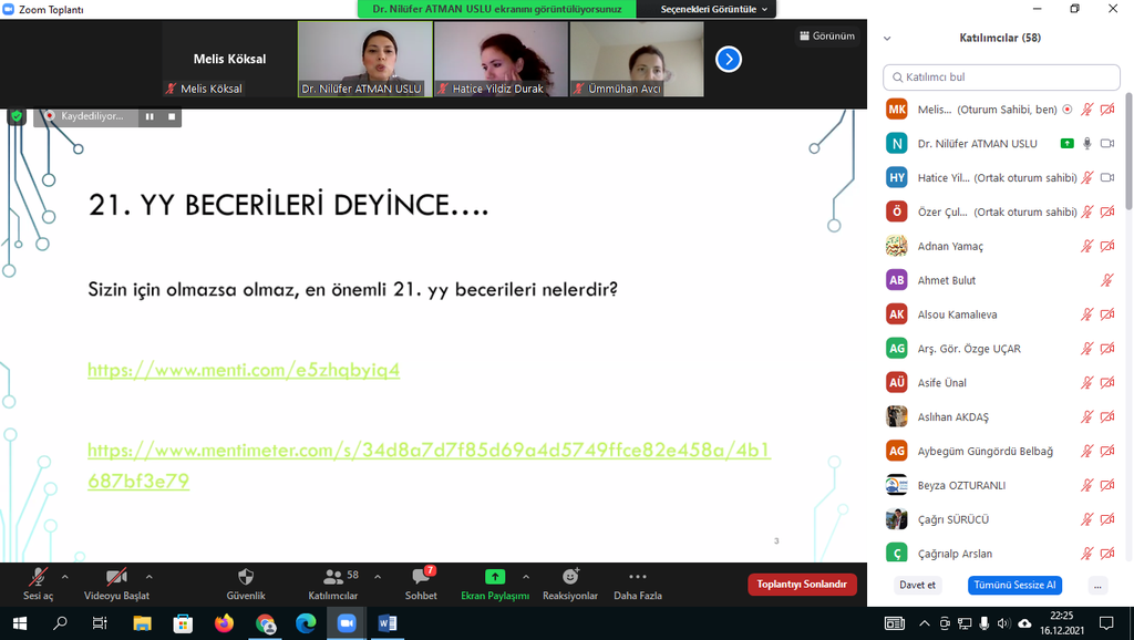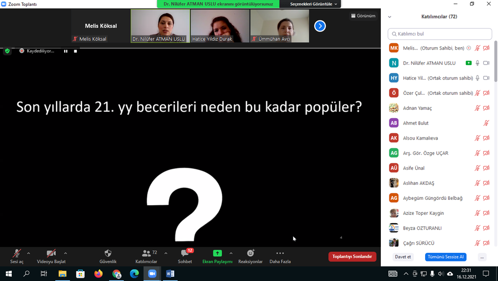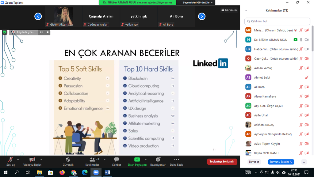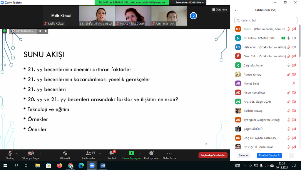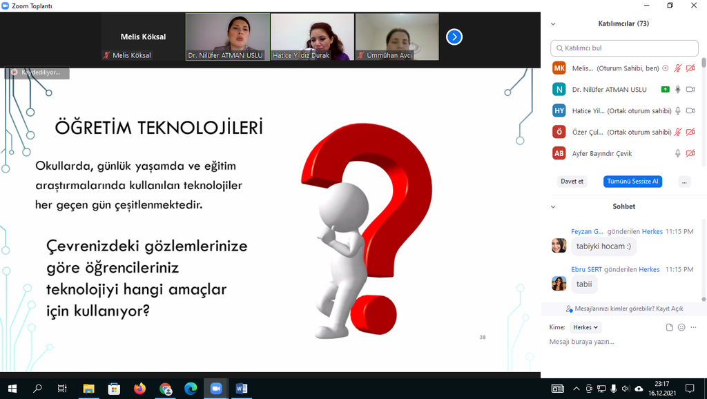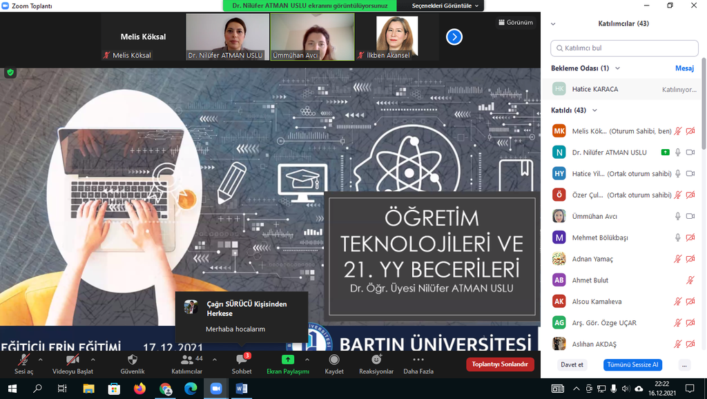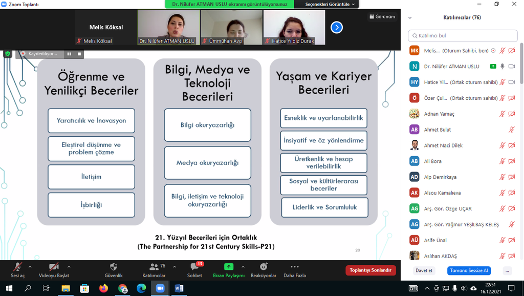 17.12.2021 tarihinde koordinatörlüğümüz aracılığı ile Dr. Öğr. Üyesi Nilüfer ATMAN USLU tarafından üniversitemiz öğretim elemanlarına'Öğretim Teknolojileri ve 21.yy Becerileri'eğitimi verildi. Çevrim içi düzenlenen eğitime katılan üniversitemiz akademik personelleri bu tarz eğitimlerden memnuniyet duyduklarını ifade ederek Kalite Koordinatörü Doç. Dr. Ümmühan AVCI'ya ve sunumlarıyla bilgilendirme yapan Dr. Öğr. Üyesi Nilüfer ATMAN USLU'ya teşekkürlerini iletti.
