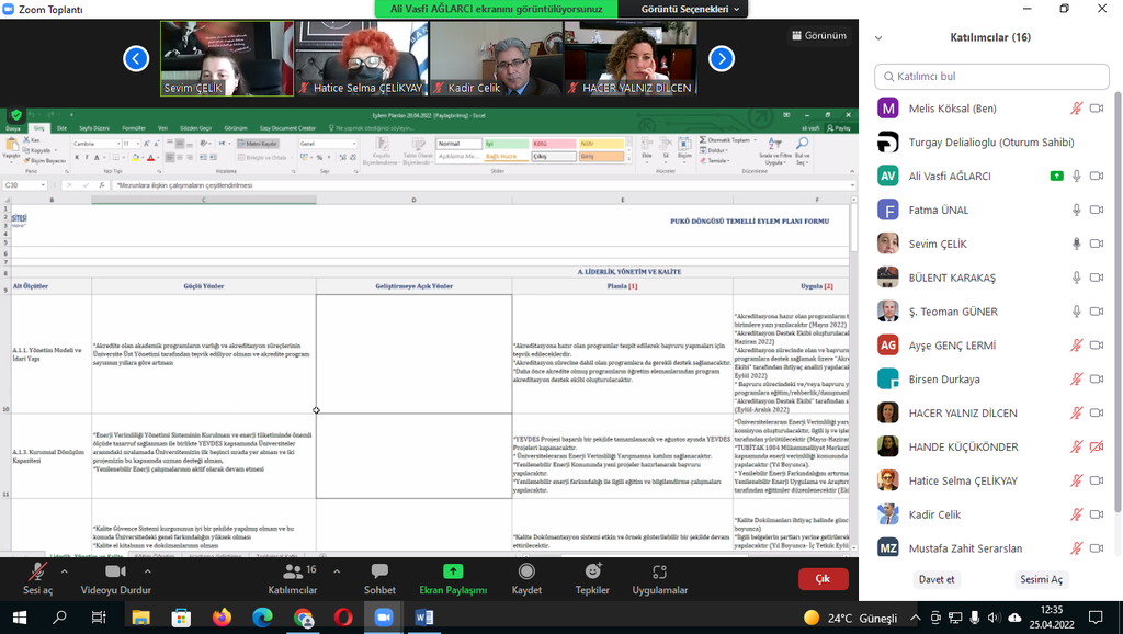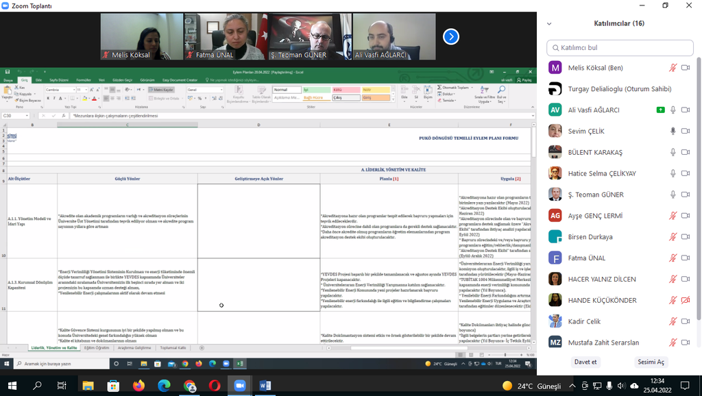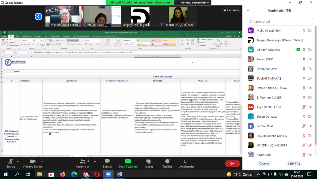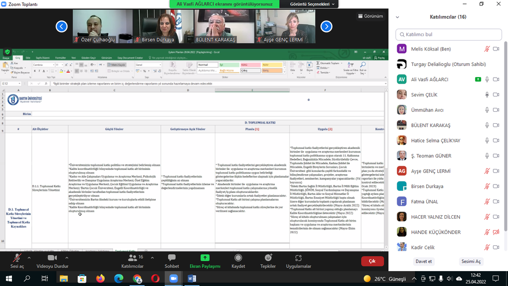 25.04.2022 tarihinde üniversitemiz Rektör Yardımcısı Prof Dr. Sevim ÇELİK başkanlığında Kalite Komisyon Üyeleri ile toplantı gerçekleştirildi. Yapılan toplantıda üniversitemizin 2022 yılı Eylem Planları görüşüldü.Toplantı sonunda Prof. Dr. Sevim ÇELİK toplantıya katılan Kalite Komisyon Üyelerine ve Kalite Koordinatörlüğü ekibine teşekkürlerini iletti.