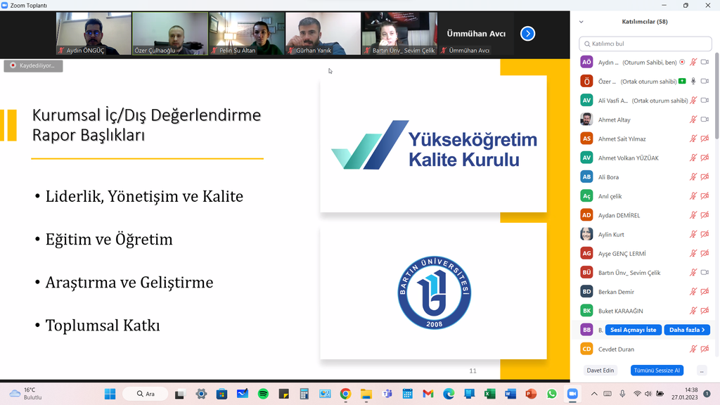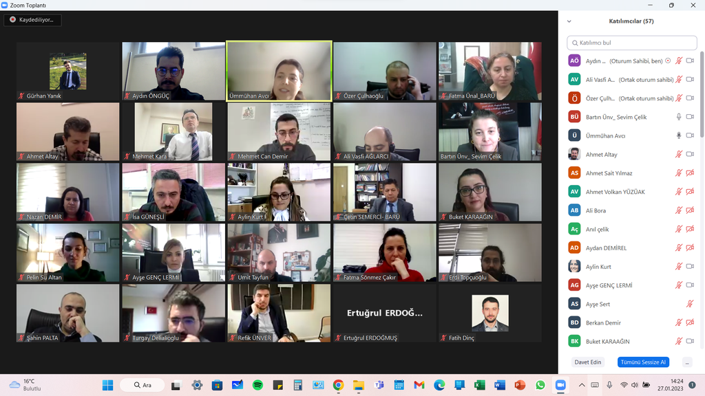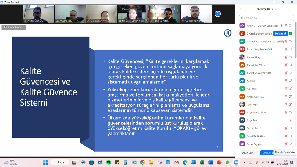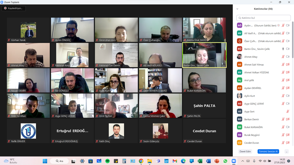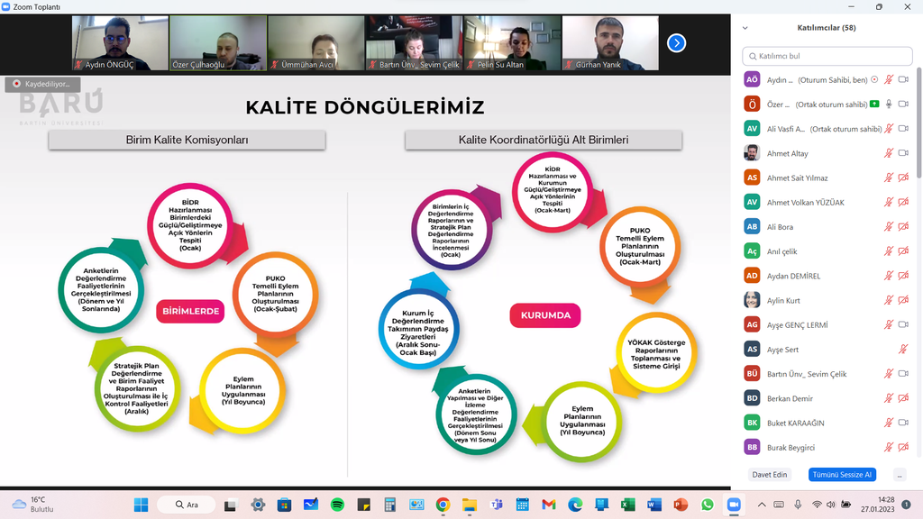 Koordinatörlüğümüz tarafından yürütülmekte olan "kalite süreçlerinin işlerliğine ve önemine binaen" 27.01.2023 tarihli ve 2023/03 sayılı toplantısı Rektör Yardımcısı Prof. Dr. Sevim ÇELİK başkanlığında Alt Birim Üyelerinin katılımıyla çevrimiçi olarak gerçekleşti.