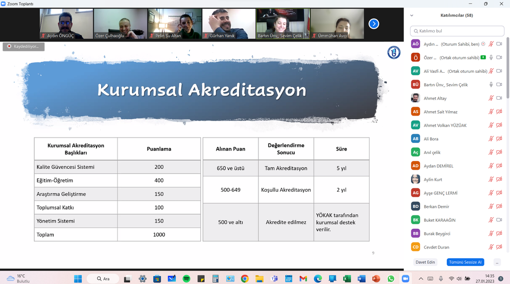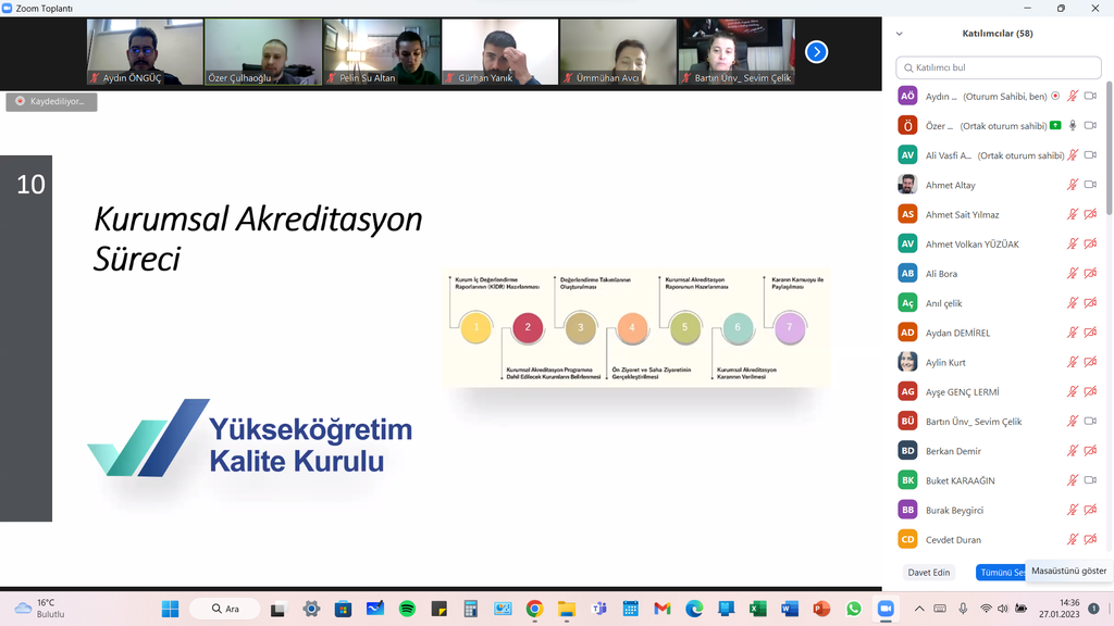 Koordinatörlüğümüz personeli Öğr. Gör. Dr. Ali VASFİ AĞLARCI ve Öğr. Gör. Özer ÇULHAOĞLU tarafından Alt Birim Üyelerine; süreç içerisinde yapılması gerekenler ve 2023 yılı içerisindeki mevcut plan/program hakkında bilgiler verildi. Ayrıca Kurum İç Değerlendirme Raporu Hazırlama Kılavuzu (Sürüm 3.1) tanıtılarak, Birim İç Değerlendirme Raporu hazırlık aşamalarında dikkat edilmesi gerekenler ile yapılması gerekenler hakkında bilgiler verildi.