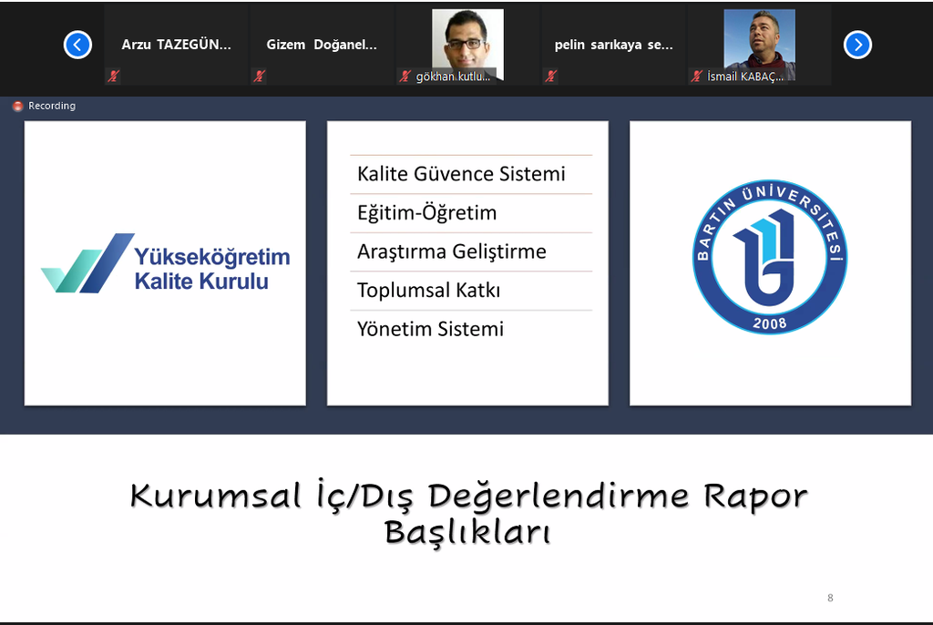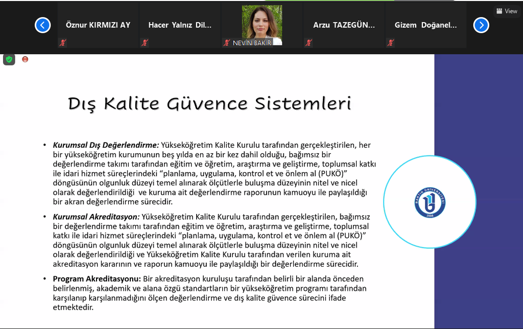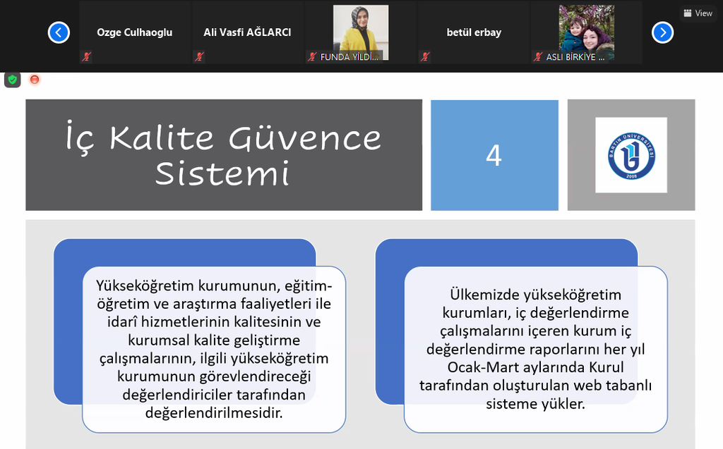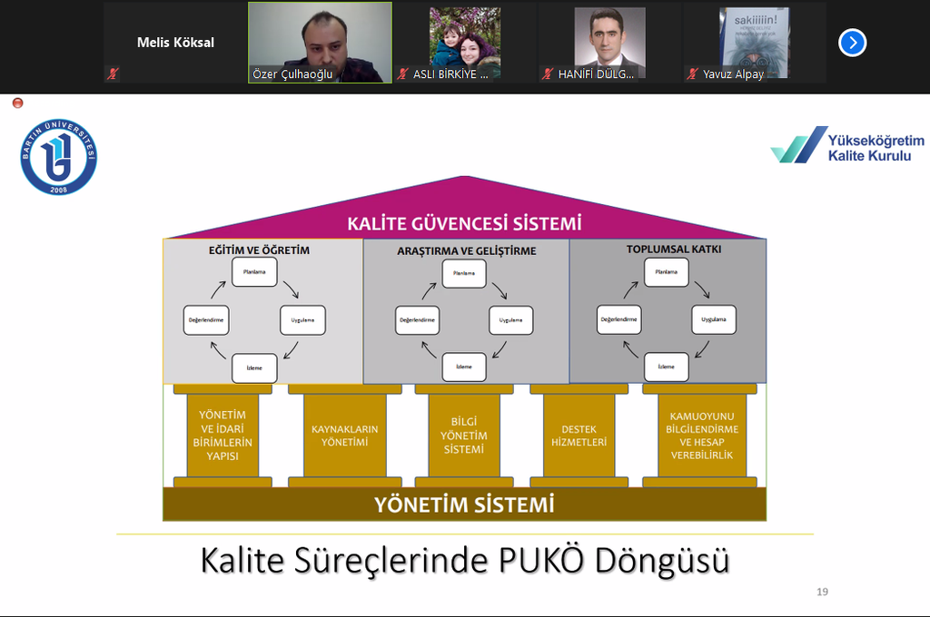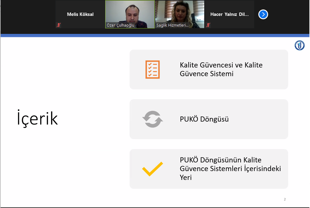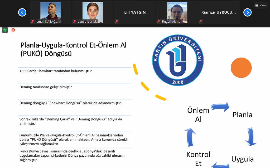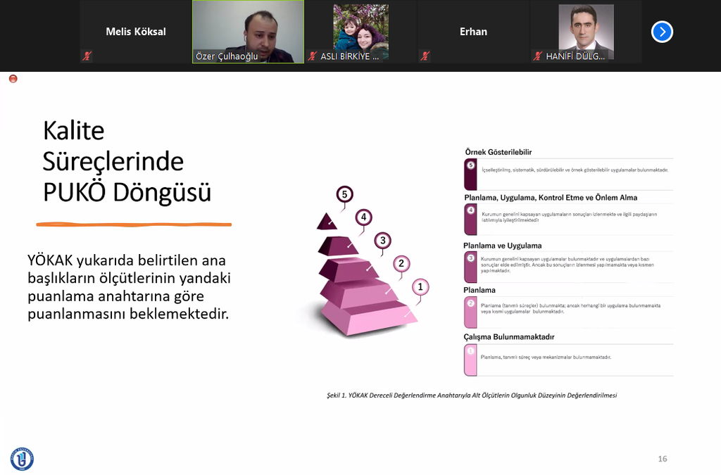 11.06.2021 tarihinde kalite koordinatörlüğünde görevli Öğr. Gör. Özer ÇULHAOĞLU tarafından Sağlık Hizmetleri Meslek Yüksekokulu’nda görevli öğretim elemanlarına PUKÖ döngüsü eğitimi verildi. Eğitimde PUKÖ döngüsünün aşamalarından olan Planla, Uygula, Kontrol Et ve Önlem Al basamakları üzerinde duruldu. Farklı durumlar için farklı odalara ayrılarak grup çalışması eşliğinde uygulamalar gerçekleştirildi. Çevrimiçi toplantıya katılan Sağlık Hizmetleri Meslek Yüksekokulu personeli Kalite Koordinatörü Doç. Dr. Fatma ÜNAL’a, sunumlarıyla bilgilendirme yapan Öğr. Gör. Özer ÇULHAOĞLU’na ve koordinatörlük personeline teşekkürlerini ilettiler.