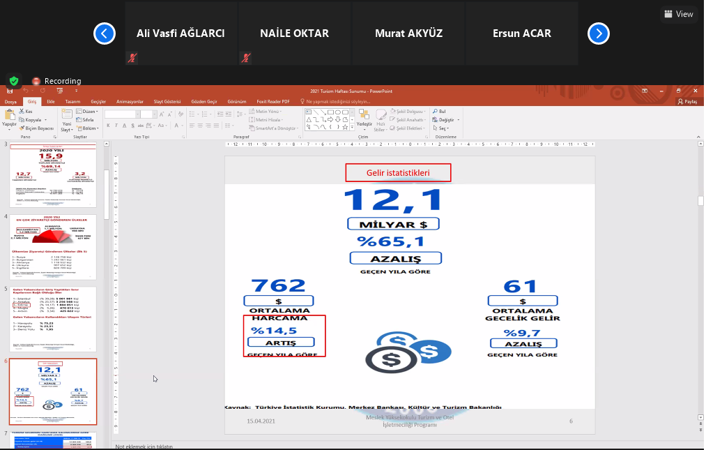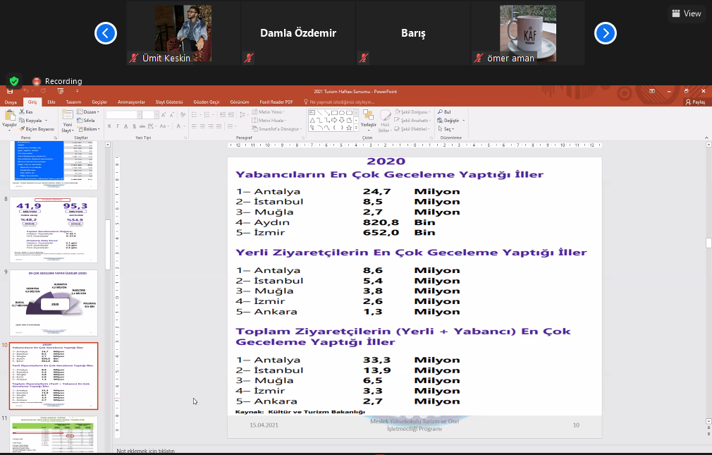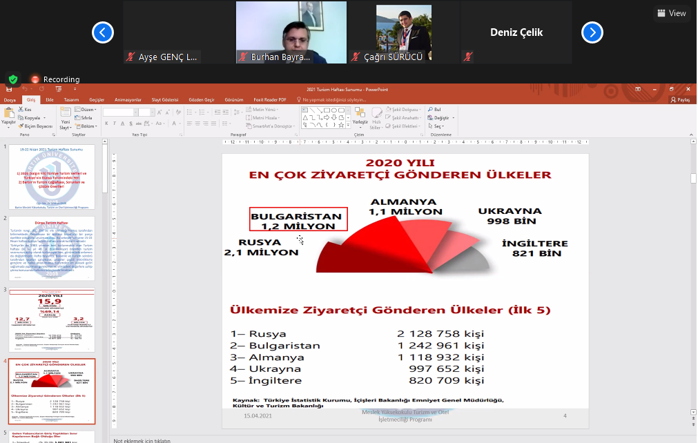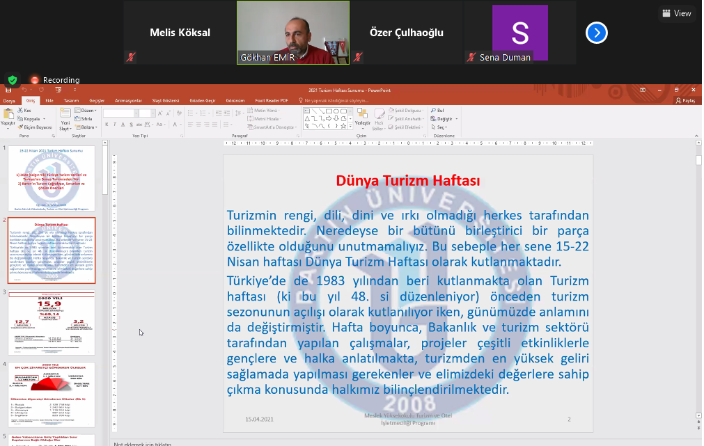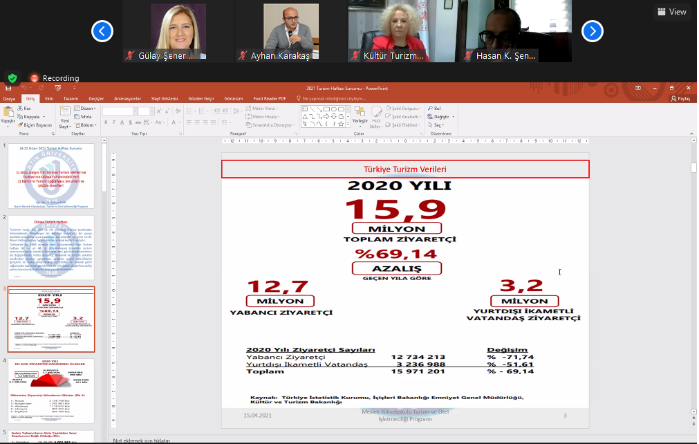 15.04.2021 tarihinde Kalite Koordinatörlüğü aracılığıyla Bartın Meslek Yüksekokulu'nda Turizm ve Otel İşletmeciliği Programından Öğr. Gör. Dr. Gökhan EMİR tarafından Dünya Turizm Haftası kapsamında '' Bartın'ın Turizm Coğrafyası, Sorunlar ve Çözüm Önerileri '' konulu bir webinar verildi. Bartın Meslek Yüksekokulu Müdürü Doç. Dr. Ayşe GENÇ LERMİ, Bartın İl Kültür ve Turizm Müdürü Handan KARAKOÇ, Bartın 112 Acil Çağrı Merkezi Müdürü Enver ÇAYIR, Bartın Ulus ve Köylerine Hizmet Derneği Başkanı Satı Lütfi OKÇU, öğretim elemanları ve öğrenciler katıldı. Çevrimiçi eğitime katılanlar eğitime ev sahipliği yapan Kalite Koordinatörüne ve personeline teşekkürlerini ilettiler.