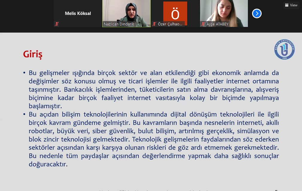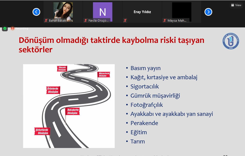 28.05.2021 tarihinde Kalite Koordinatörlüğü aracılığıyla Bartın Meslek Yüksekokulun'da Yönetim ve Organizasyon BÖlümünden Öğr. Gör. Nazlıcan DİNDARİK ve Öğr. Gör. İrem ŞAHMUTOĞLU tarafından 'Dijital Dönüşüm Teknolojilerinin Mesleklere ve Sektörlere Etkisi' eğitimi verildi. Bartın Meslek Yüksekokulu Müdürü Doç. Dr. Ayşe GENÇ LERMİ, öğretim elemanları ve öğrenciler katıldı. Çevrimiçi eğitime katılanlar eğitime ev sahipliği yapan Kalite Koordinatörüne ve personeline teşekkürlerini ilettiler.