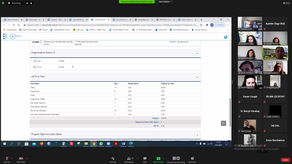 4 Mart 2021 tarihinde saat 11.00’de Kalite Koordinatörü Doç. Dr. Fatma Ünal ve Doç. Dr. Sinem Tarhan’ın katılımıyla “Akreditasyon Sürecinde Ölçme Değerlendirme ve Öğrencilerle Etkileşim” konusunda Eğiticilerin Eğitimi programı Zoom üzerinden gerçekleştirildi. Eğitime Peyzaj Mimarlığı Bölümü öğretim elemanları ile bölüm öğrencileri katılım gösterdi. Eğitim sonunda katılımcılar Kalite Koordinatörlüğüne, Doç.Dr. Fatma ÜNAL'a ve Doç. Dr. Sinem TARHAN'a teşekkürlerini ilettiler.