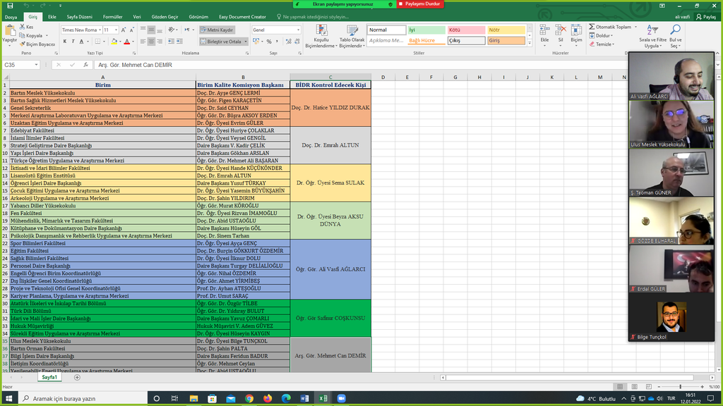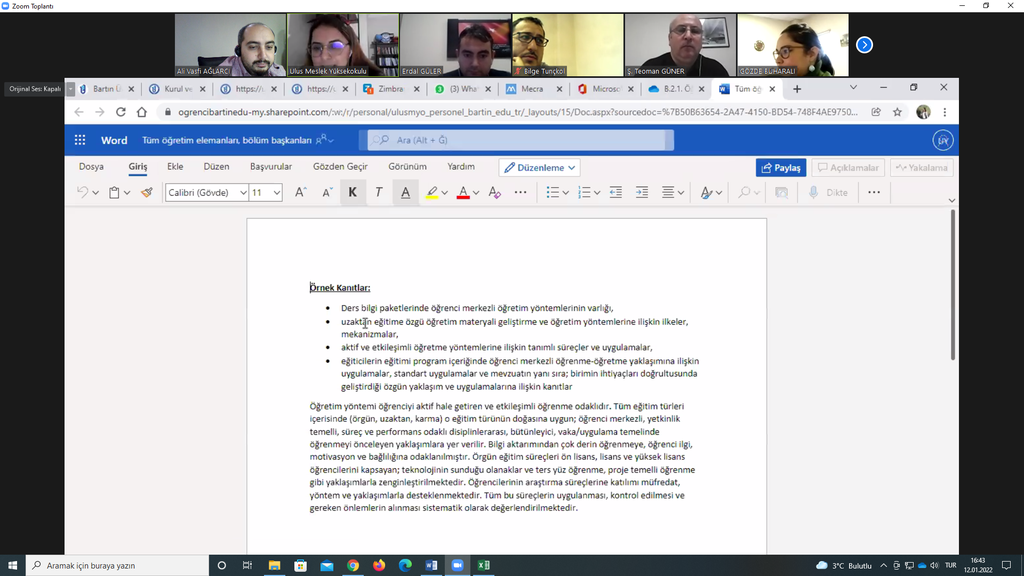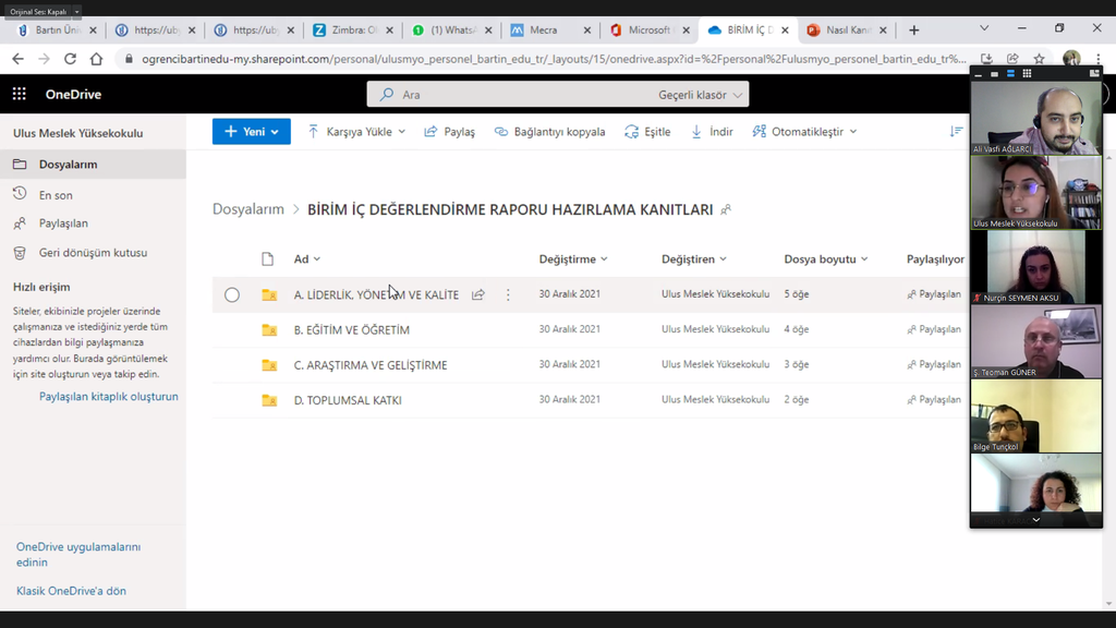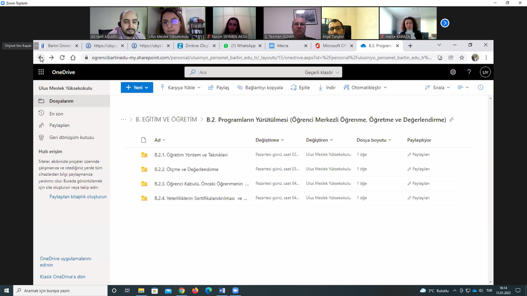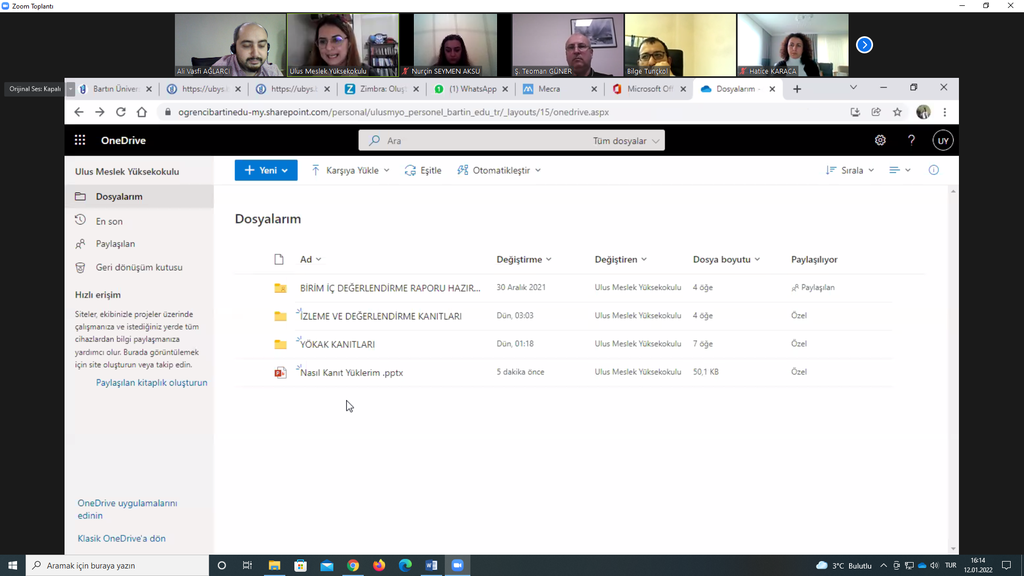 12.01.2022 tarihinde Kalite Koordinatörlüğümüz tarafından Ulus MYO öğretim görevlilerine ve birim kalite komisyonuna BİDR ve kanıtlar hakkında çevrimiçi ortamda bilgilendirme yapılarak danışmanlık sağlandı. Yapılan toplantı sonunda birim kalite komisyon başkanı ve üyeleri ile Ulus MYO müdürü katkılarından dolayı Koordinatörlüğümüze teşekkürlerini ilettiler.