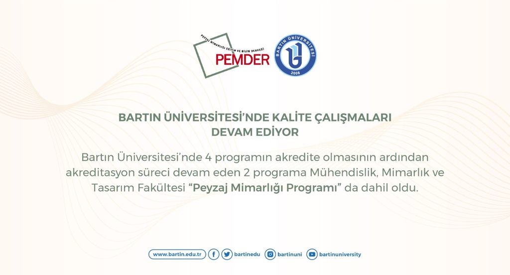 Üniversitemizde 4 programın akredite olmasının ardından akreditasyon süreci devam eden 2 programa Mühendislik, Mimarlık ve Tasarım Fakültesi Peyzaj Mimarlığı Programı da dahil oldu. Akredite olmak için Peyzaj Mimarlığı Eğitim ve Bilim Derneği’ne (PEMDER) yapılan başvurunun ardından Üniversitemiz ile birlikte Akdeniz, Atatürk, Düzce, Ege ve İstanbul Teknik Üniversitesi’nin Peyzaj Mimarlığı programları resmi akreditasyon süreçleri başlamış oldu.