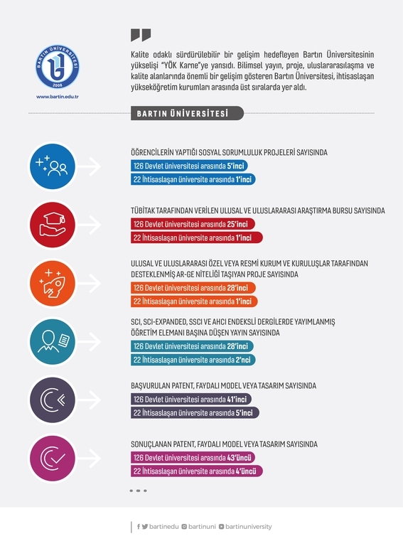 Üniversitemizin 2019-2023 Stratejik Planı ile birlikte “Sürdürülebilir İyileşme ve Kalite” ekseninde yürüttüğü çalışmaların sonuçları da “YÖK Karne”ye yansıdı. 2020 yılında 4 programın akredite olduğu, 2021 yılında bu sayının 5’e çıktığı ve çalışmaların titizlikle sürdürülen akredite edilmiş program sayılarında Bartın Üniversitesi 35’inci sıraya yerleşti.